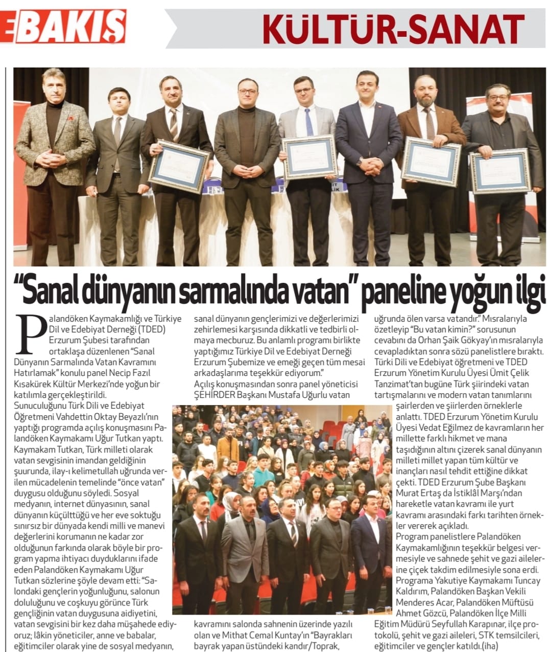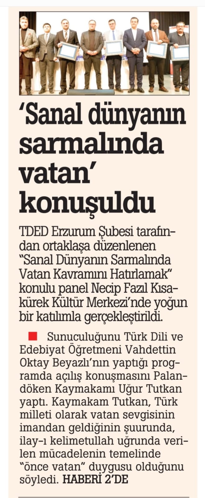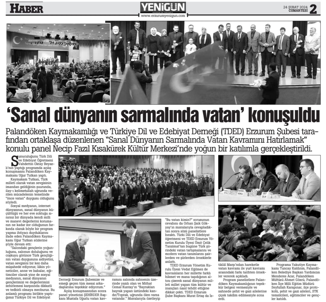 23/02/2024TDED Erzurum’un Erzurum Palandöken Kaymakamlığıyla ortaklaşa tertip ettiğimiz "Sanal Dünya Sarmalında Vatan Kavramını Hatırlamak" başlıklı panele gençlerden, şehit ve gazi ailelerinden yoğun bir ilgi vardı.