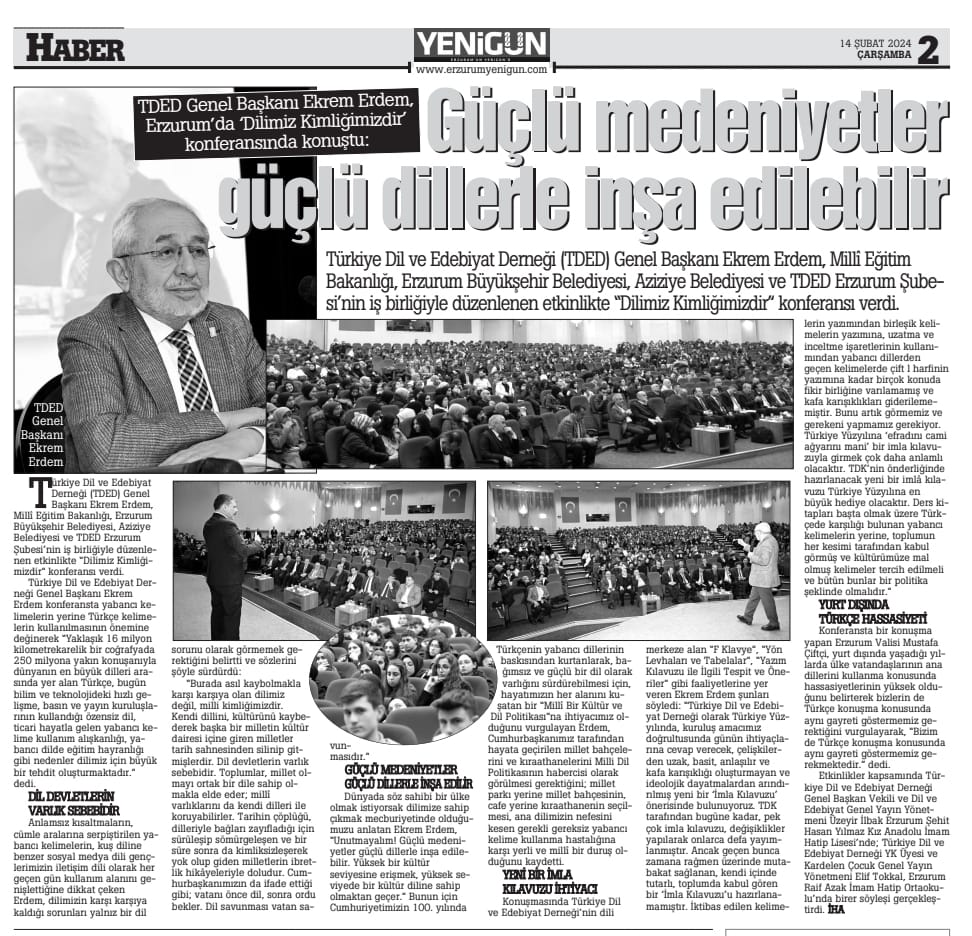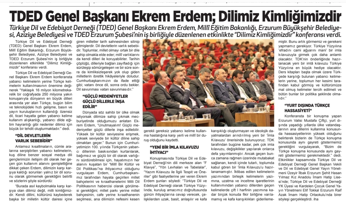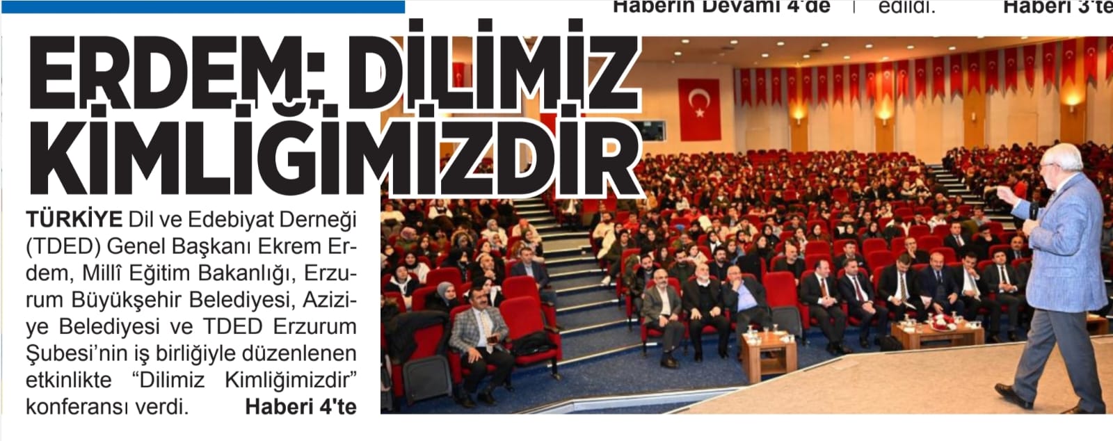 13/02/2024Türkiye Dil ve Edebiyat Derneği (TDED) Genel Başkanı Ekrem Erdem, Millî Eğitim Bakanlığı, Erzurum Büyükşehir Belediyesi, Aziziye Belediyesi ve TDED Erzurum Şubesi’nin iş birliğiyle düzenlenen etkinlikte “Dilimiz Kimliğimizdir” konferansı verdi