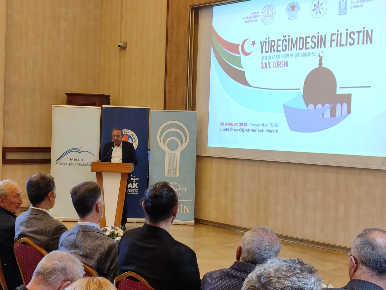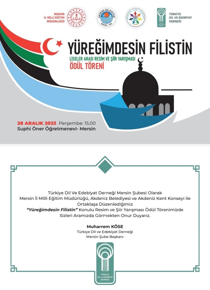 28/12/2023Türkiye Dil ve Edebiyat Derneği Mersin Şubesi, Akdeniz Belediyesi, İl Milli Eğitim Müdürlüğü ve Akdeniz Kent Konseyinin işbirliği ile düzenlen “Yüreğimdesin Filistin” konulu liselerarası düzenlenen resim ve şiir yarışmasının ödül töreni yapıldı.