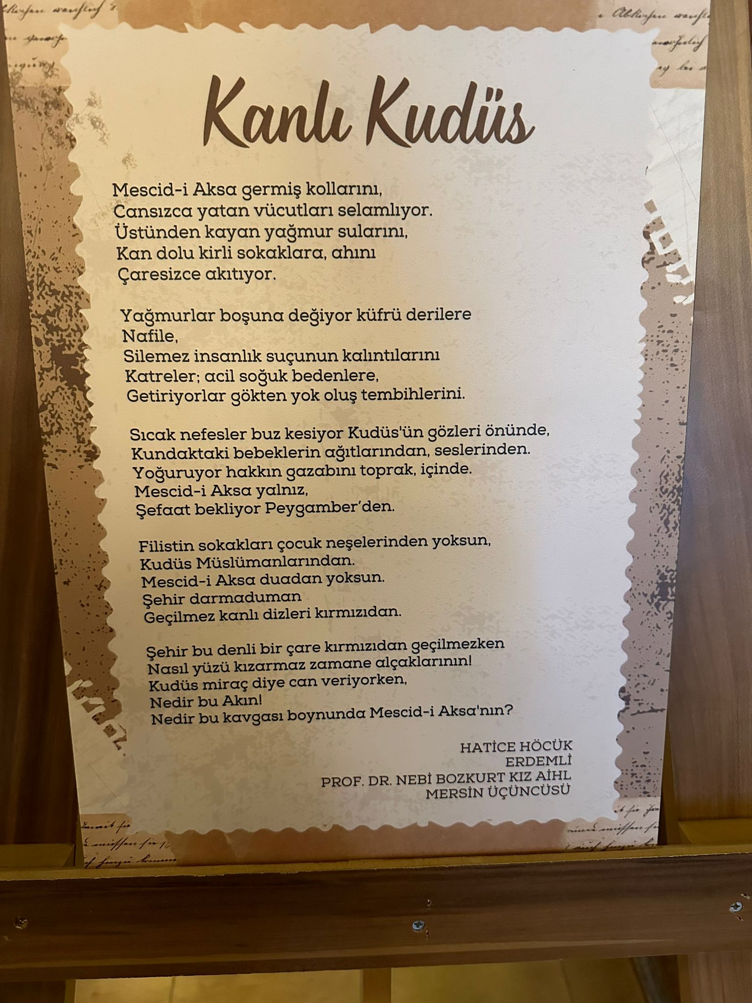 Müslümanlar için Mekke’deki Kâbe, Medine'deki Mescid-i Nebevi gibi, Kudüs'teki Mescid-i Aksa da o derece önlemlidir, kıymetlidir. Kudüs, Hazreti Davut Peygamberin fethettiği Hazreti Süleyman Peygamberin şekillendirdiği, Hz. İsa’nın göğe, Peygamberimiz Hazreti Muhammed'in miraca yükseldiği yerdir. Bu yönüyle de bütün semavi dinlerin önemli saydığı, kutsal saygıyı değer atfettiği bir yerdir. Bu kadar değerli bir yere insanoğlunun gözü gibi bakması, gönülden bakması gerekir. İşte bizim ecdadımız bu topraklara, bu kutsal emanetlere gönülden bakmış, gözünden sakınmış ve oralara namert elini dokundurtmamıştır. Ancak 1917 yılından itibaren İngilizlerin yönetimine geçmesi ile bu durum değişmiştir. 1967 yılında İsrail'in eline geçmesiyle o günden bugüne yaşanan problemler giderek artmıştır. Oysa bizim devletimizin kontrolü altında sadece Müslümanlar değil bütün diğer inançlara mensup insanlar bu topraklarda huzur ve barış içerisinde yaşamışlardır. Türkiye Cumhuriyeti Devleti kurulduktan sonra da ve orada 1967 yılında İsrail Devleti kurulduktan sonra da ülke olarak Filistin ile bağımızı koparmadık. Bir gün inşallah dünyada gerçek manada iyilikten, güzellikten yana olan öldürmekten değil, yaşatmaktan yana olanlar kazanacak diyor, hepinizi sevgiyle, saygıyla selamlıyorum.” İfadelerini kullandı.