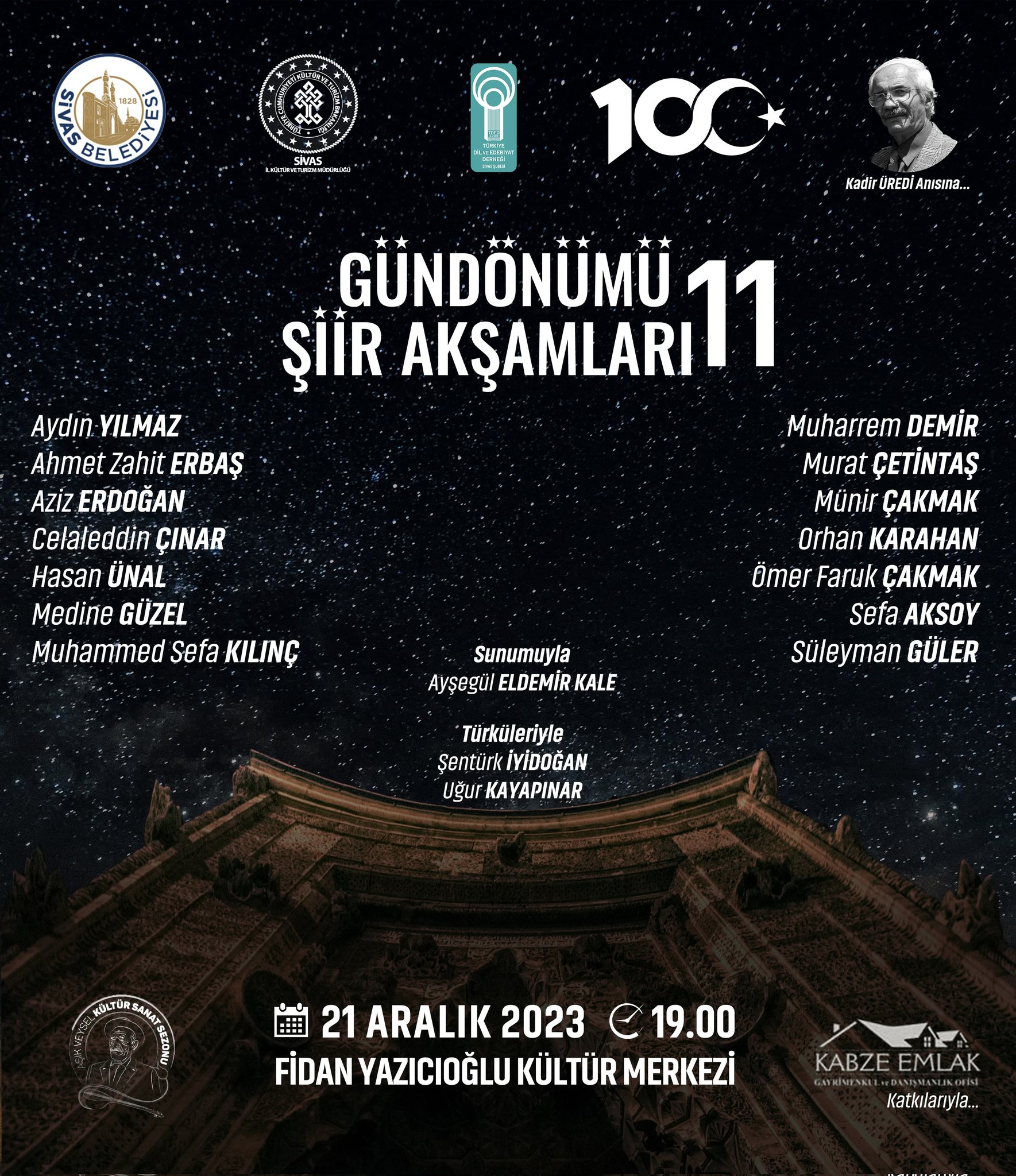 22/12/2023Gündönümü Şiir Akşamları programının on birincisi Sivaslı yazar Kadir Üredi anısına düzenlendi. Şairlerin en uzun geceyi şiirleriyle aydınlattığı programa kurum-kuruluş müdürleri ve STK başkanları ve şiir severler katıldı. Uğur Kayapınar ve Şentürk İyidoğan türküleriyle renk kattı.