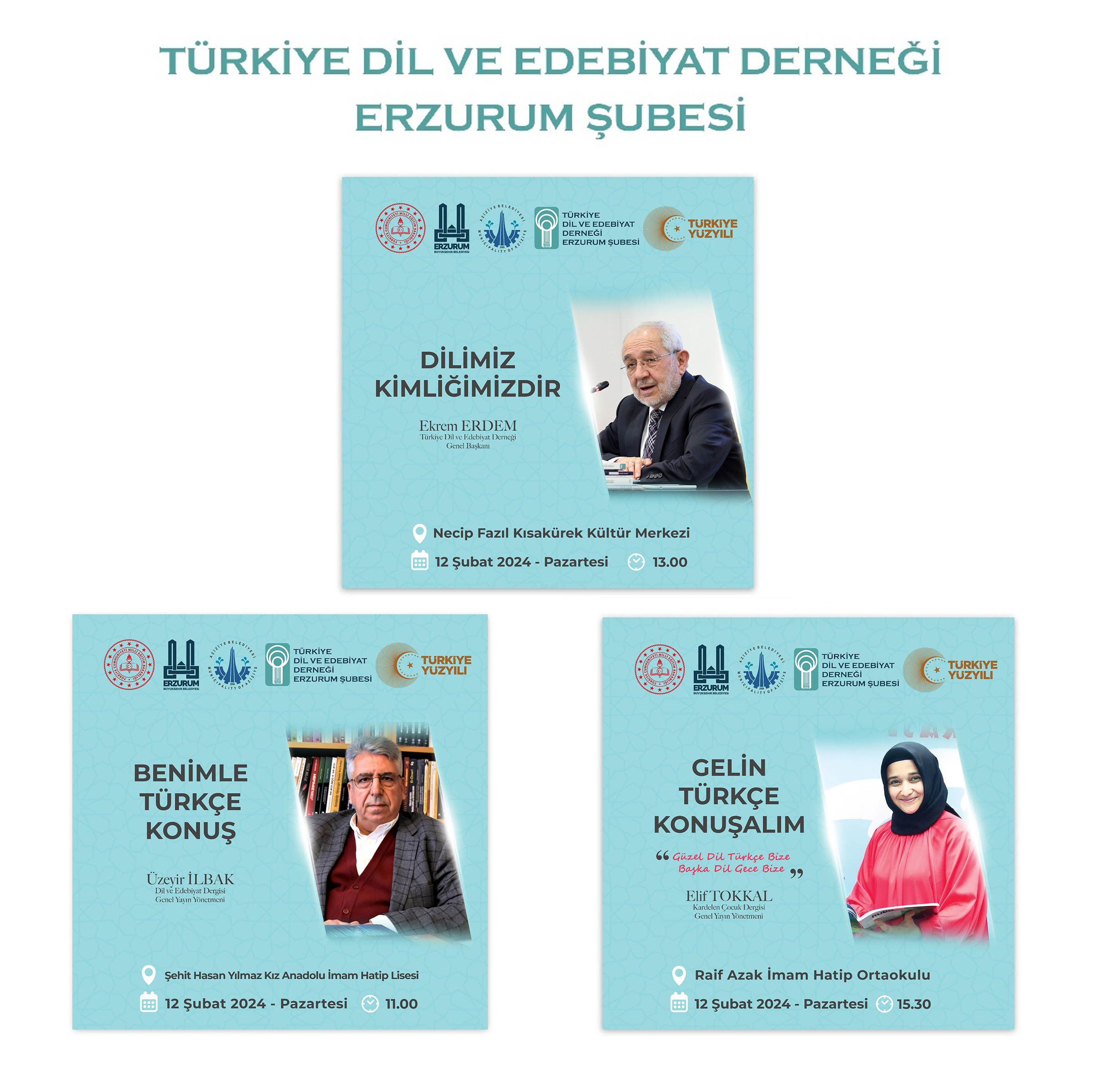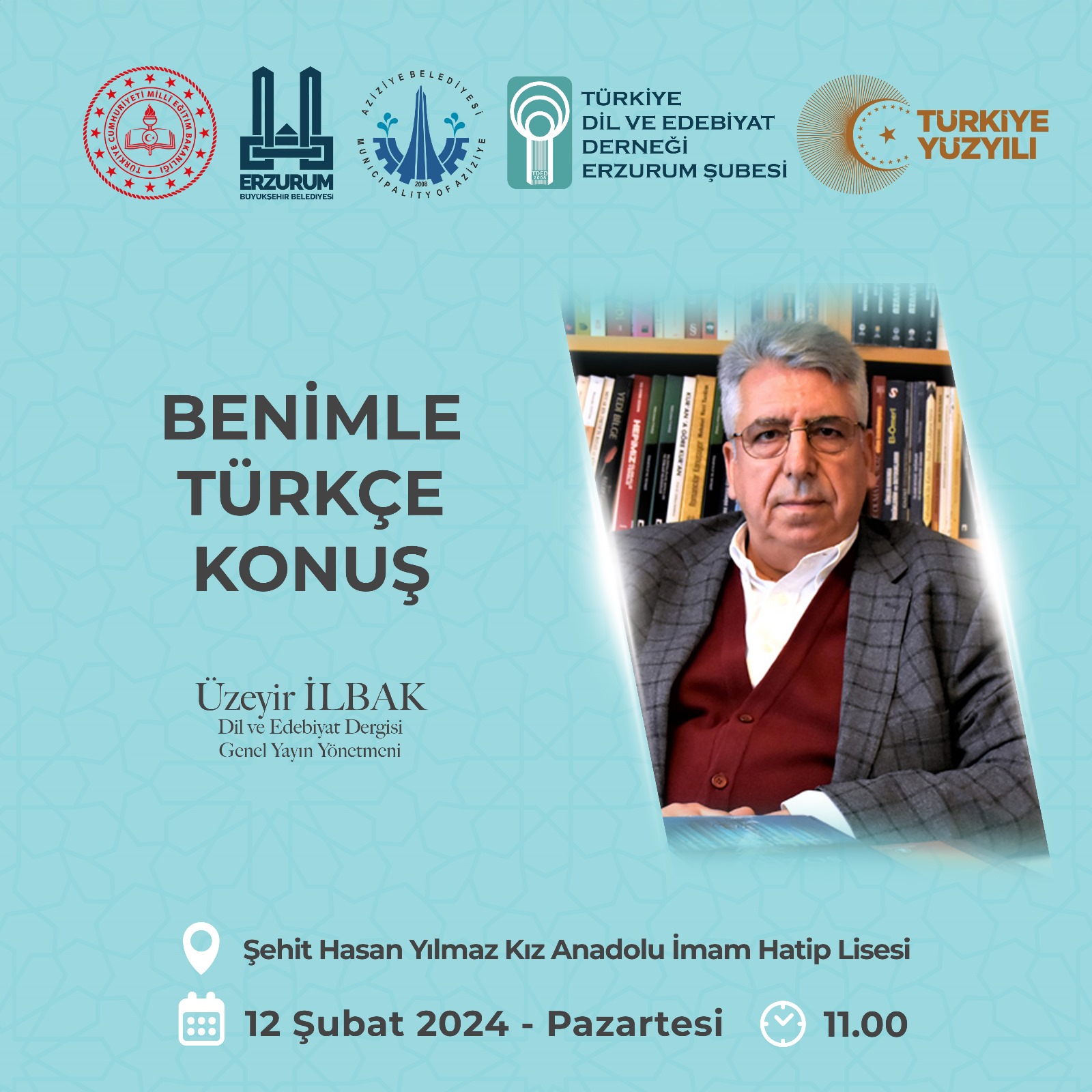 Türkiye Dil ve Edebiyat Derneği Genel Başkan Vekili ve Dil ve Edebiyat Genel Yayın Yönetmeni Üzeyir İlbak, 12 Şubat Pazartesi günü saat 11.00’de Erzurum Şehit Hasan Yılmaz Kız Anadolu İmam Hatip Lisesi’nde “Benimle Türkçe Konuş” başlıklı bir söyleşi yapacak.