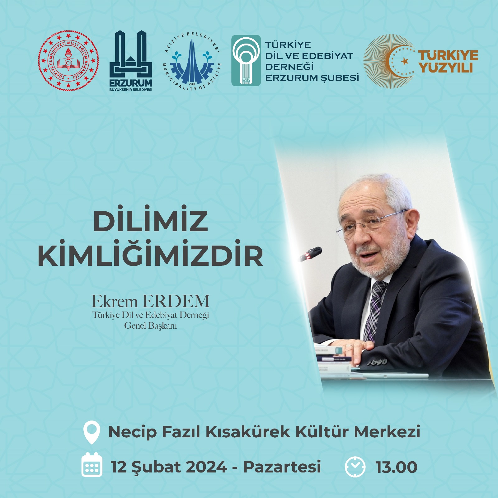 Türkiye Dil ve Edebiyat Derneği Genel Başkanı Ekrem Erdem, 12 Şubat Pazartesi günü saat 13.00’te Erzurum Necip Fazıl Kısakürek Kültür Merkezi’nde “Dilimiz Kimliğimizdir” başlıklı bir konferans verecek.