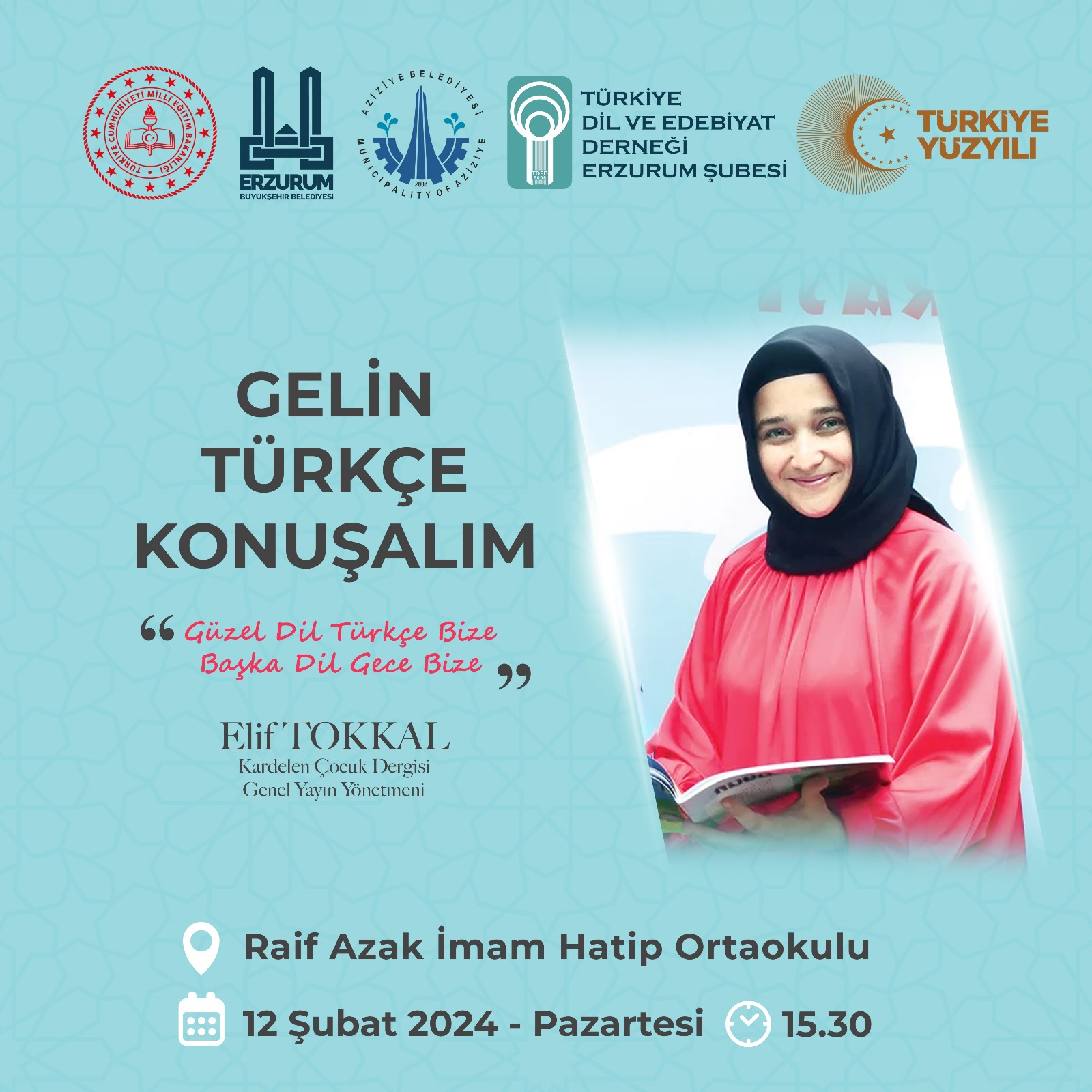 Türkiye Dil ve Edebiyat Derneği YK Üyesi ve Kardelen Çocuk Genel Yayın Yönetmeni Elif Tokkal, 12 Şubat Pazartesi günü saat 15.30’da Erzurum Raif Azak İmam Hatip Ortaokulu’nda “Gelin Türkçe Konuşalım” başlıklı bir söyleşi yapacak.