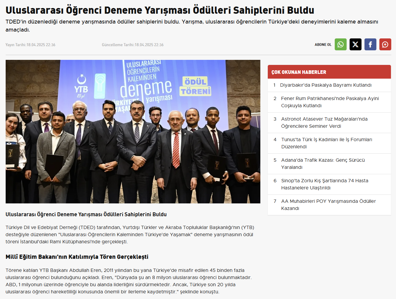 Türkiye Dil ve Edebiyat Derneğince (TDED) Yurtdışı Türkler ve Akraba Topluluklar Başkanlığının (YTB) desteğiyle düzenlenen "Uluslararası Öğrencilerin Kaleminden Türkiye'de Yaşamak" deneme yarışmasının ödül töreni İstanbul Rami Kütüphanesi'nde yapıldı. YTB Başkanı Abdullah Eren, programda konuşma yaptı.