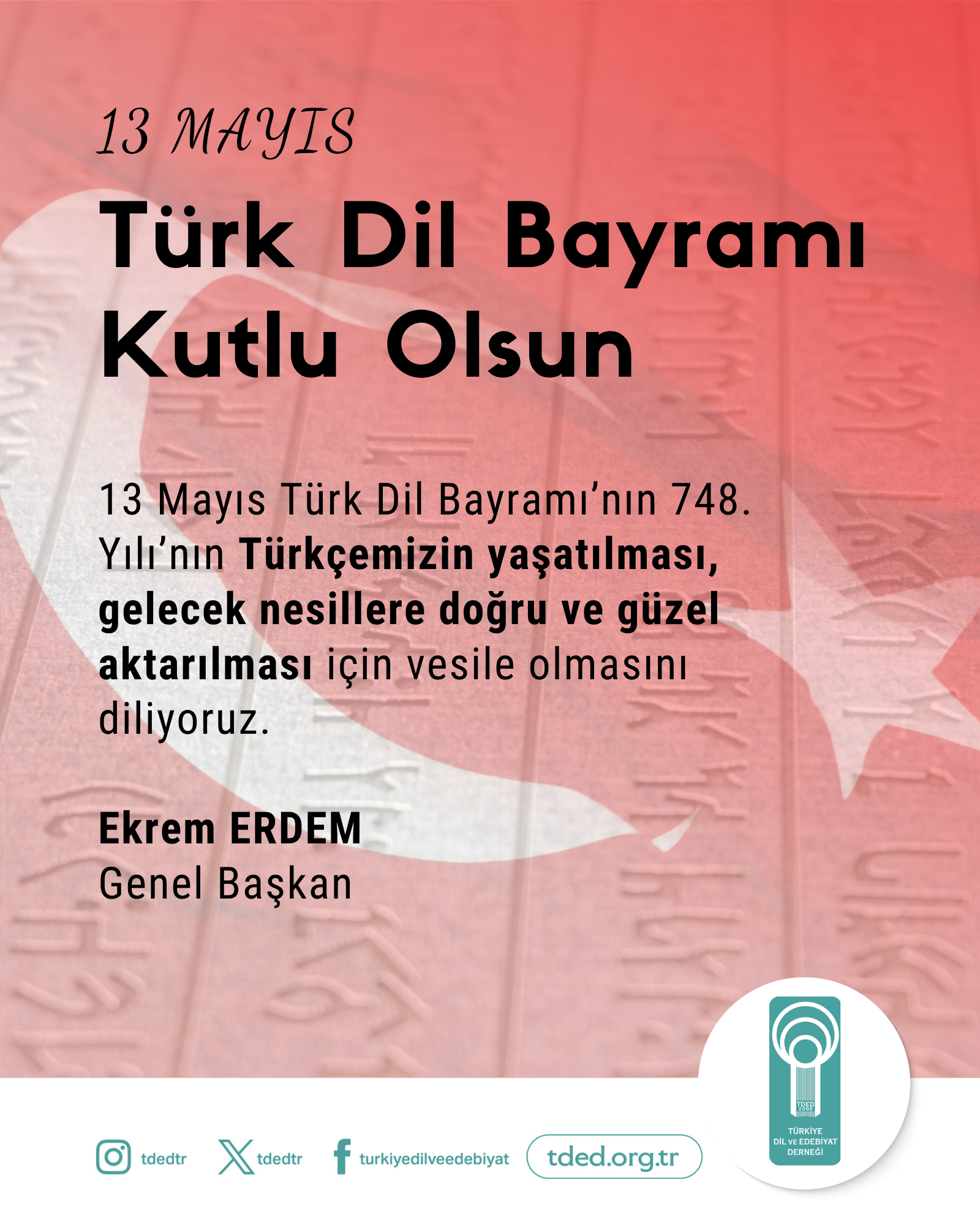 Anasayfa TÜRK DİL BAYRAMI KUTLU OLSUN TÜRK DİL BAYRAMI KUTLU OLSUN 13/05/2025 13 Mayıs Türk Dil Bayramı’nın 748. Yılı’nın Türkçemizin yaşatılması, gelecek nesillere doğru ve güzel aktarılması için vesile olmasını diliyoruz.Ekrem ERDEMGenel Başkan Galeri