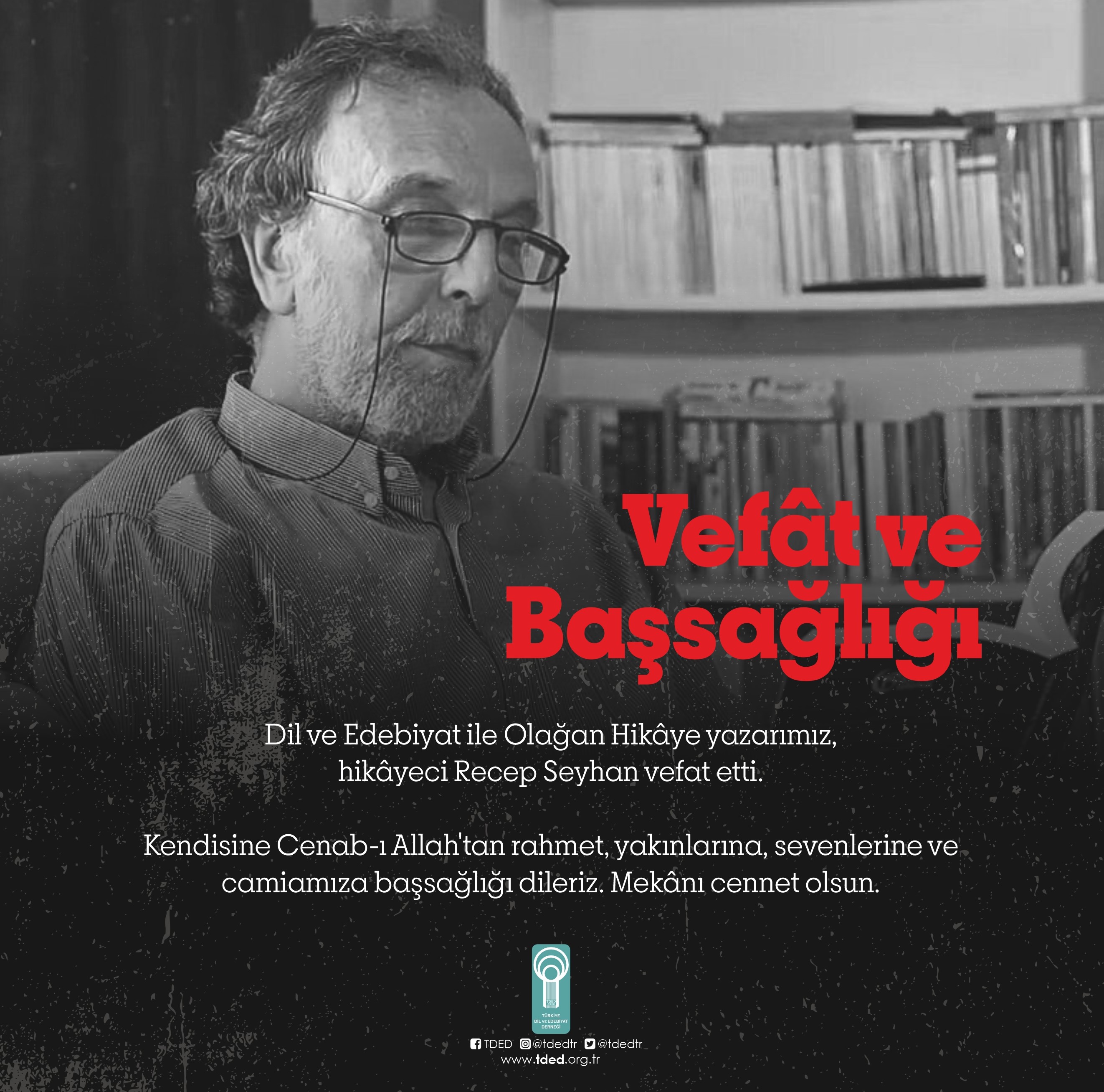 Anasayfa YAZARIMIZ RECEP SEYHAN VEFAT ETTİ YAZARIMIZ RECEP SEYHAN VEFAT ETTİ 28/10/2023 Dil ve Edebiyat ile Olağan Hikâye yazarımız, hikâyeci Recep Seyhan vefat etti.Kendisine Cenab-ı Allah'tan rahmet, yakınlarına, sevenlerine ve camiamıza başsağlığı dileriz. Mekânı cennet olsun. Galeri
