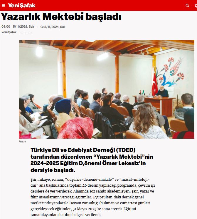 05/11/2024Türkiye Dil ve Edebiyat Derneği (TDED) tarafından düzenlenen “Yazarlık Mektebi”nin 2024-2025 Eğitim Dönemi Ömer Lekesiz’in dersiyle başladı.