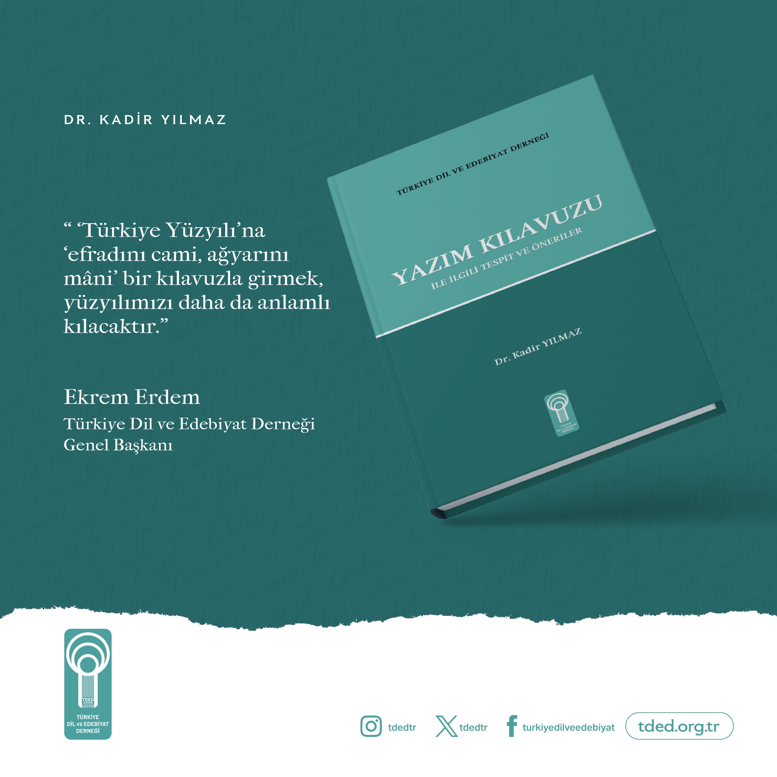 25/03/2024Türkiye Dil ve Edebiyat Derneği (TDED), Cumhuriyet’in 100. yılında günümüz ihtiyaçlarına cevap verecek, basit, anlaşılır bir “İmlâ Kılavuzu” ihtiyacı üzerine, Genel Başkan Ekrem Erdem’in önerisiyle Cumhuriyet Üniversitesi Öğretim Üyesi Dr. Kadir Yılmaz tarafından hazırlanan “Yazım Kılavuzu ile İlgili Tespit ve Öneriler” kitabını yayımladı.