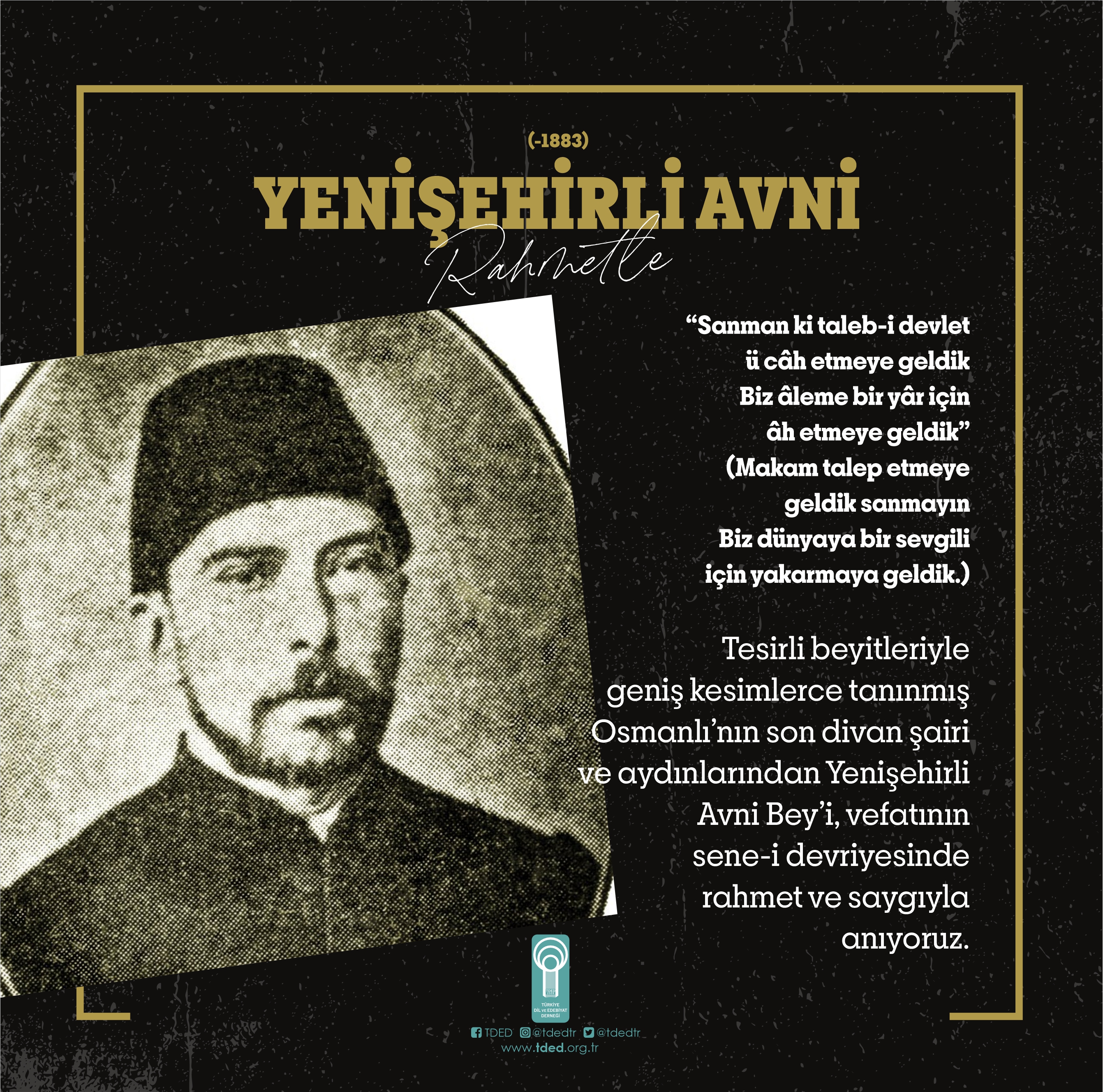 Tesirli beyitleriyle geniş kesimlerce tanınmış Osmanlı’nın son divan şairi ve aydınlarından Yenişehirli Avni Bey’i, vefatının sene-i devriyesinde rahmet ve saygıyla anıyoruz.